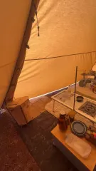忘れ物多く急遽のレイアウトがこんな感じ😅お座敷スタイルにするつもりはなかったけどフラップ忘れた事で狭くなりお座敷に😅 そして、1番問題の中のビラビラ😅テントクリップで留めてみました‼️意外と綺麗に留まった🙌 あとは底冷えね🥶これは耐えるのみ🤣それでも全体にマットを敷けたし絨毯は持