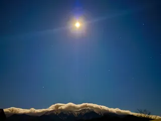 おはようございます😊キャンプ場も少し明るくなって来ました!テントの目の前にお月様🌕八ヶ岳の上には雲がそれでも幻想的な景色が見れました! 現在−6.5℃本日も寒い🥶朝でございます🥶 職員さん朝4時からお勤め!ご苦労様です😆