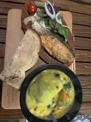本日の朝食です❣️久々に魚🐟サーモンのムニエルにしました😊家で仕込みして来たロールキャベツ!ソフトクーラーに入れて幕内にあったのに冷凍になってました🤣 そして…問題なのがテント⛺️雪❄️が降り続き埋まってます!撤収が…😭