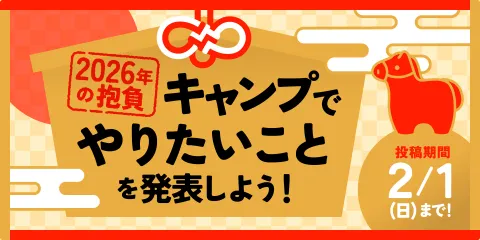 【開催中!】投稿イベント「2026年にキャンプでやりたいことを発表しよう!」 \2026年のキャンプの抱負を大募集!🎍/ 新しい1年、あなたはどんなアウトドア体験をしたいですか? 「今年こそソロキャン!」「新作キャンプ飯に挑戦」など、あなたの抱負をぜひシェアしてください。 特典: 投稿者全員に「100ポイント」プレゼント! 投稿の締め切