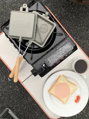 NEW 🍞 新レンタル品「ホットサンドメーカー」登場! 🍞 具材を挟んで焼くだけで、外はカリッと中はとろ〜り✨ハムチーズ、ツナマヨ、チョコバナナなど、アレンジは自由自在! ガスコンロや焚火での直火調理OK🔥朝ごはんにも、おやつや夜の焚火タイムにもぴったり。 香ばしい香りとできた