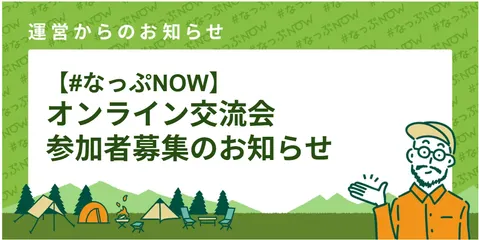 NEW #なっぷNOW オンライン焚き火交流会 ~ゆるく繋がろう~ いつも#なっぷNOWをご利用いただきありがとうございます。この度 #なっぷNOW のみなさんからのご要望にお答えして12月11日(木)に「オンライン交流会」を開催することになりました。#なっぷNOWのみなさんでオンラインで集まって、 あたかもキャンプで焚き火を囲んでいるかのようにおしゃべりしながら一