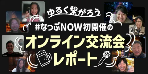 NEW 【ゆるく繋がろう】初開催のオンライン交流会レポート 12月11日に、#なっぷNOWを利用されている方々のオンライン交流会を開催しました!テーマは「ゆるく繋がろう」とし、日々#なっぷNOWを活用されている方々同士が繋がる場を目指しました。参加いただいたメンバーは、みきみきさん、くぼちゃんさん、たけし31△さん、Ryutaxxxxさんの4名に加え、スタッ