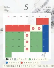 本年度(2026年)の5月〜7月シーズンカレンダーを公開しました。ハイシーズン・トップシーズン・平日割引対象日など、ご予約やご来場の参考にぜひご活用ください。6月は梅雨のため定休日水木となります6月中はキャンセル料金無料対応となります なお、キャンセル待ちが出やすい人気日程や、グループ利用
