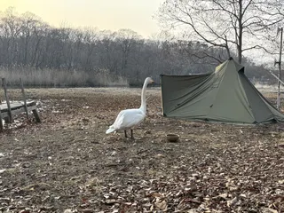 北海道 苫小牧市 美々川プライベートキャンプ場⛺️白鳥🦢に会えるキャンプ場♪その名はボンちゃん!野生の白鳥ですが数年前にキタキツネに襲われて、羽に大きな損傷。それ以降飛ぶことが出来なくなり、ここ美々川に住み着いたらしです!今ではすっかり人に慣れ、全然逃げません😮テクテク歩く姿がメチャクチャ可愛いです