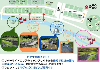 5月~9月は、RECAMP足利で川遊びキャンプを楽しもう!RECAMP足利では隣接する親水公園で川遊びが楽しめます!ダムを観ながら安全に川遊びができる場所は、全国でもあまりみられません。自然豊かな涼しい清流で、たくさんの生き物探しや水遊びで夏が満喫できます♫小さなお子さんから大人まで、ファミリーで楽