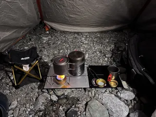 徒歩キャンプ反省会。やっぱりテント、ペグ合わせて4.5kgにもなって、かつ化繊シュラフだとどうしても容積的に圧迫され、自由度は低いんだなと再確認しました。かといって徒歩用に色々買い直すのも現実的でない。もう少し暖かい時期に限定すればいいのでしょうが夏場は夏場で氷だの保冷剤だのを持つことになるし、今後