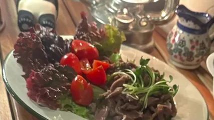 NEW 🏕️映えるおっさんキャンプ飯🏕️ 砂肝 大葉 コンソメ 炒めただけ 可愛いお皿に盛り付けすれば ま〜なんということでしょ〜😎