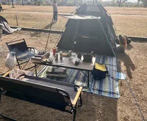 NEW ブラックテント まだまだ初心者🔰なので、少しお安めのブラックテントを購入しました😘⛺️✨✨ 折りたたみなので初めての設置で5分、ペグを打ってポールを立てて10分でした❣️❣️骨組みをまっすぐにするだけなのでめちゃ楽😍 片付けは骨組みを引っ張って畳んで、丸めるだけなのでス