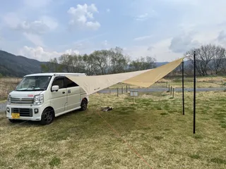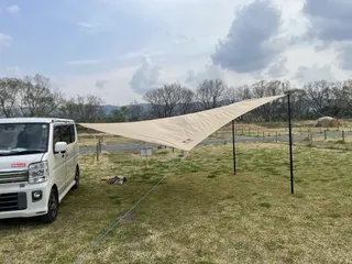 保津川水辺公園オートキャンプ場🏕️✨来週ファミキャンに行くので🥰ホームのこちらでヘキサタープを張る練習💖レイアウトは最低限で、秘密基地感を出してみました❣️❣️もう1組、お孫さんにキャンプ体験をさせてあげてる方とお話しさせて頂いて😊タープの事など色々教えてくださいました✨✨サイトには、スノーピ