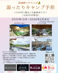 【湯ったりキャンプ手形 はじまります】 冬キャンプに“歩いて行ける温泉”という楽しみをプラスした、新しい過ごし方を提案する取り組みがスタートします。 湯ったりキャンプ手形(1,100円) を購入すると、参加キャンプ場の温泉を 各施設1回ずつ無料 で利用できます(重複利用は不可)。