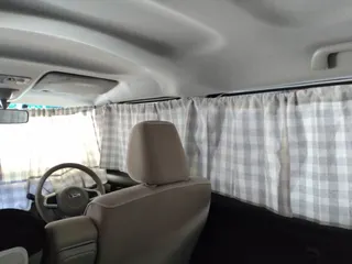 車のカーテン完成〜。フロントカーテンは最初に買ったマルチカバー(というただの布)を半分に切って同じ柄の突っ張り棒の通せるカフェカーテンに縫い付け長さを足した。40cmだったのが60cmになったのでしっかり隠れる。サイドとリアは買ったカフェカーテンの長さのまま車中カフェではそのままで車中泊の時には下に